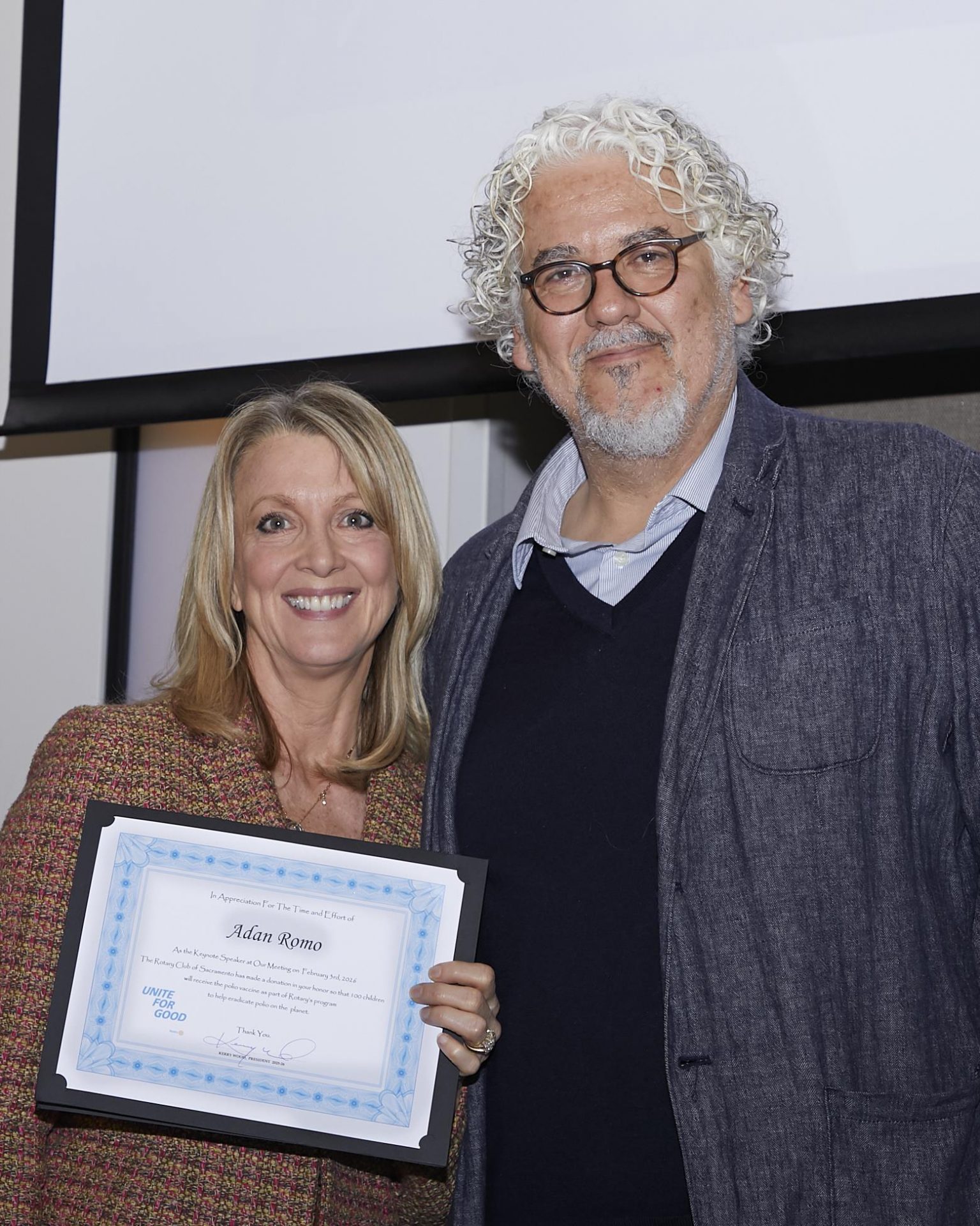 After the revenue-raising, Prez Kerry beckoned forth Tim Comstock, who introduced his longtime friend and our guest speaker, Adan Romo. Adan is a Sacramento resident and world renowned artist, and in his youth he was a Rotary Ambassador Scholar, learning the sculpting trade in Italy thanks to Rotary.