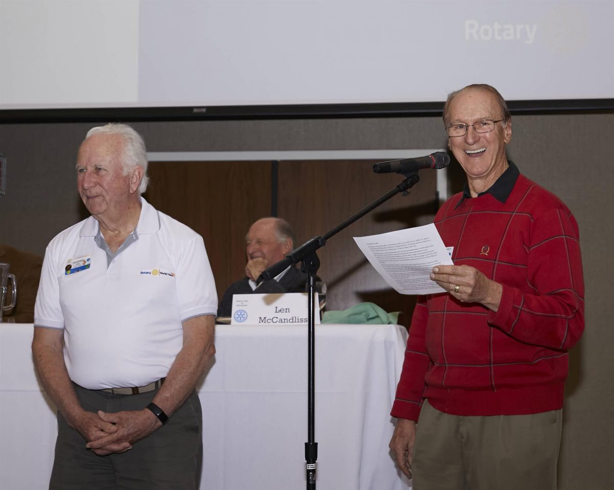 President Kerry Wood saluted the club’s birthday boys and girls – John Wood, Matt Page, Ed Melia, Shirlee Tully, Brooks Cutter, John Goralka, and President-elect Paul Keefer.