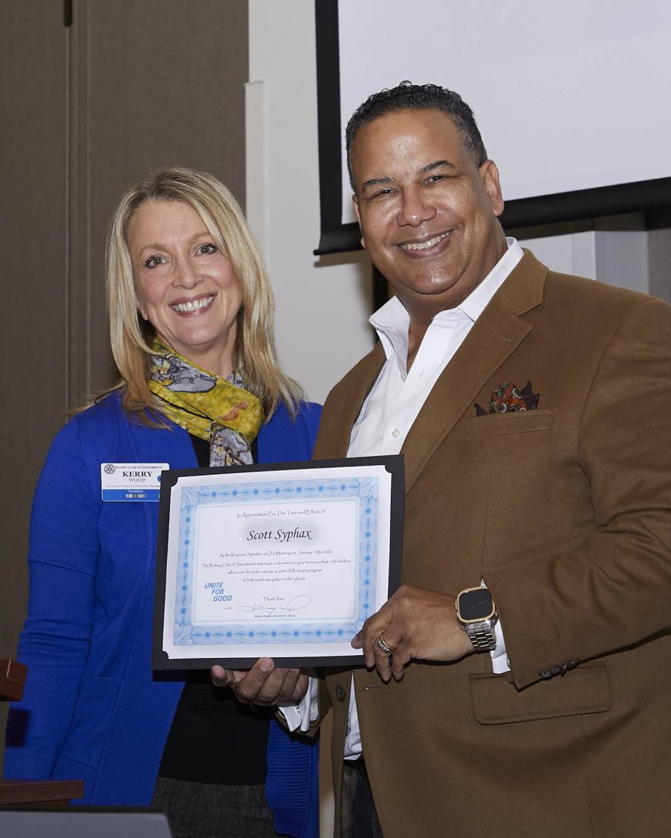 Meeting sponsor PP Thom Gilbert donated his time to Deanna Hanson, president of the Renaissance Society. Based at Sacramento State, the Renaissance Society serves primarily retirees and Sacramentans aged 50+ with intellectually stimulating courses and presentations. The Renaissance Society has about 1,800 members and is entering its 40th year. Since 1993, it has awarded over $290,000 in scholarships to Sacramento State students and supports the college food pantry for students experiencing food insecurity. She encouraged any seasoned person with a passion for learning and a desire for community connection to explore the new spring course list and consider joining.