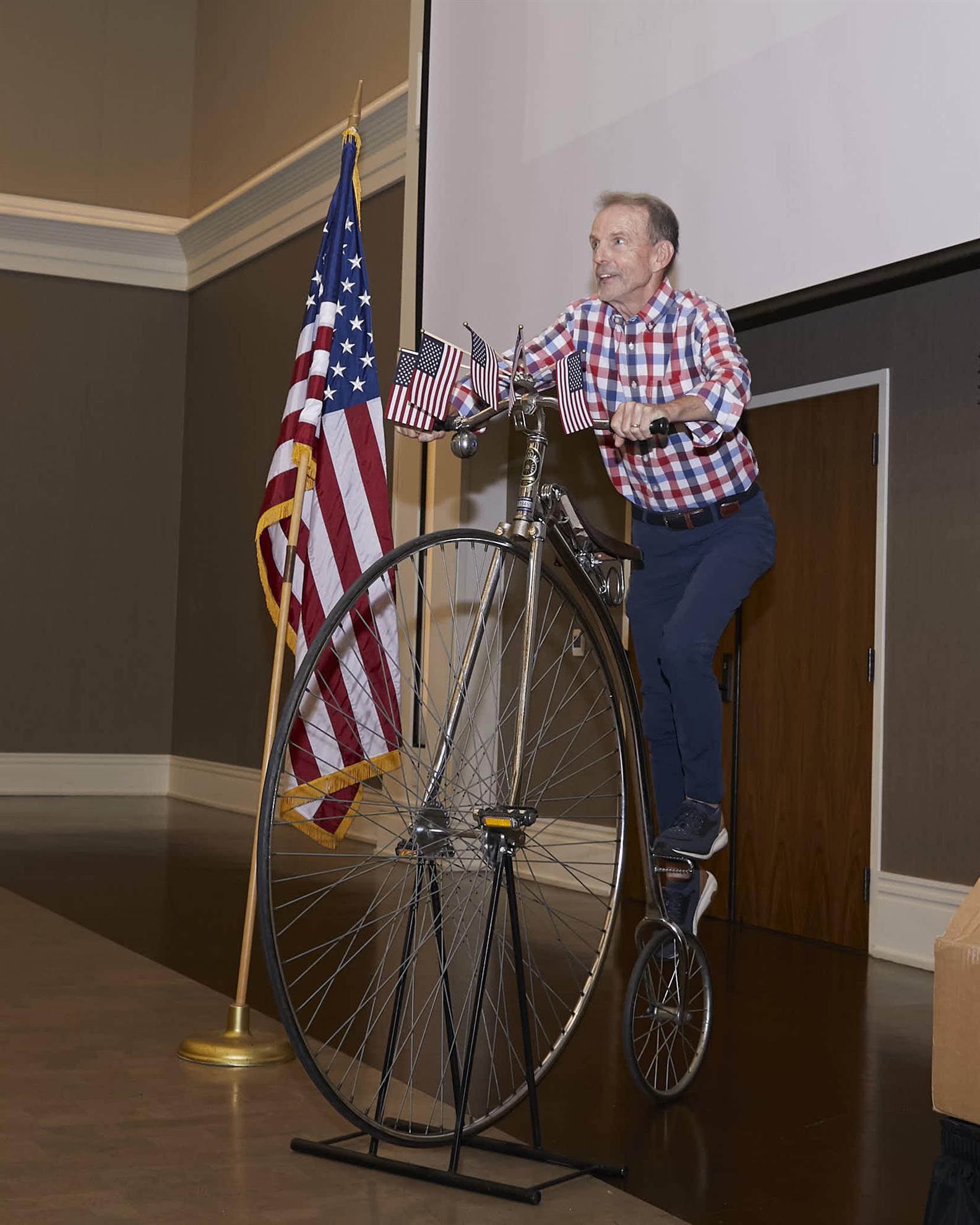 The day’s cycling theme was carried through by guest speakers Bob Bowen and Dave Takemoto-Weerts of the US Bicycling Hall of Fame and its museum, located in Davis. Dave walked the club through the early history of the bike, leading up to the game-changing pneumatic tire. Bob talked about the Hall’s 2008 relocation to Davis, discussed some key figures in cycling history, and ended up with a demonstration on how to mount a vintage “penny farthing” bicycle from biking’s earliest days.